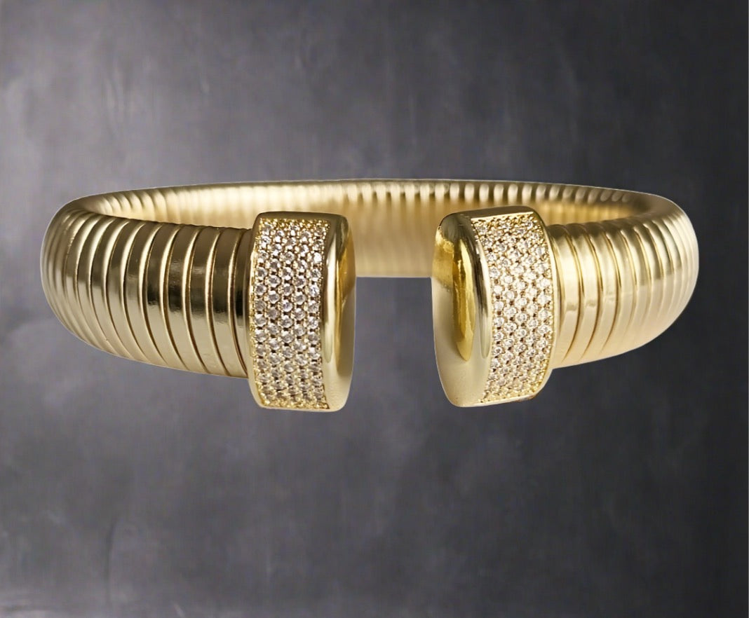 This bangle features a chunky design that adds a touch of bling. Its bold appearance makes it a versatile accessory for any outfit, effortlessly elevating your style. With its sturdy structure and eye-catching appeal, this bangle will surely become a staple in your jewelry collection. 18k Gold Plated high quality Steel.