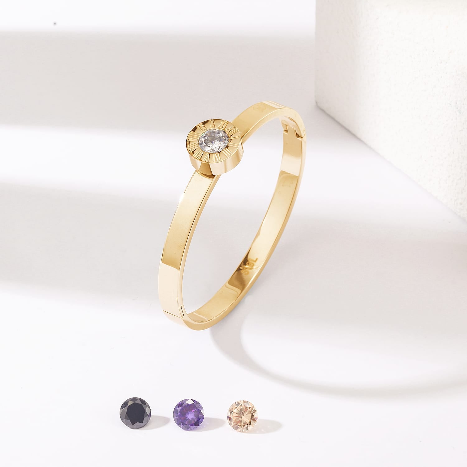 Add a touch of sophistication to your accessories collection with our Bangle Interchangeable Roman Numeral. Crafted with high-quality 18k gold plating, this bangle features interchangeable stones in elegant Roman numerals. Perfect for adding a personal touch to your outfit, while also exuding timeless elegance. Stones: clear, black , purple and champagne.