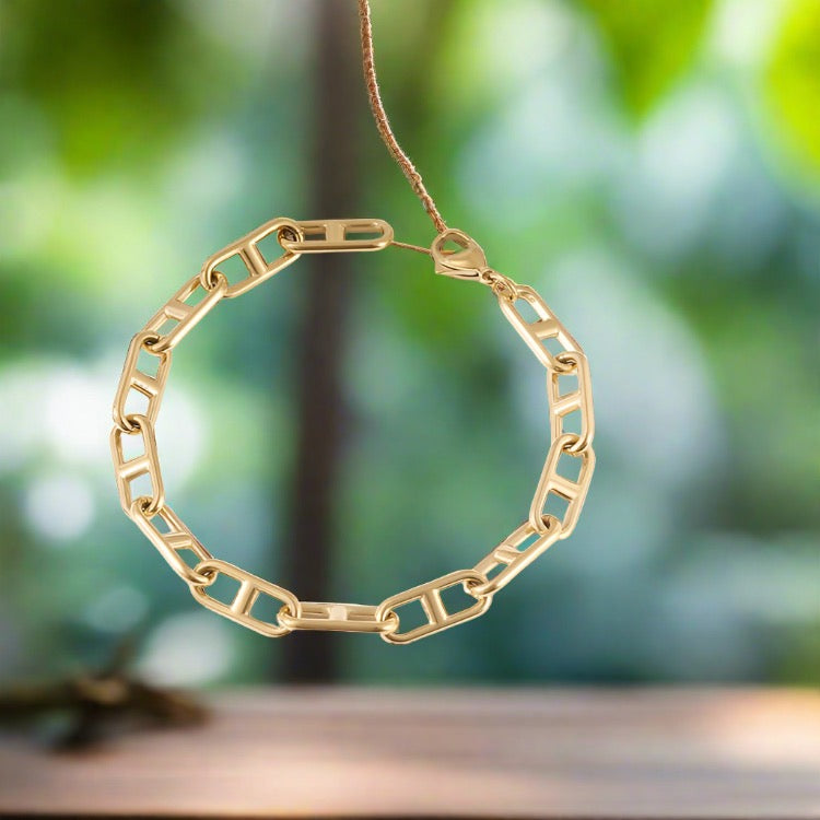 This 18k gold n plated chunky love link bracelet is expertly crafted to add a touch of elegance and style to any outfit. The love link design symbolizes enduring love, making it a meaningful gift for yourself or a loved one. Made of high-quality materials, this bracelet is a timeless addition to any jewelry collection. 18k Gold Plated Steel