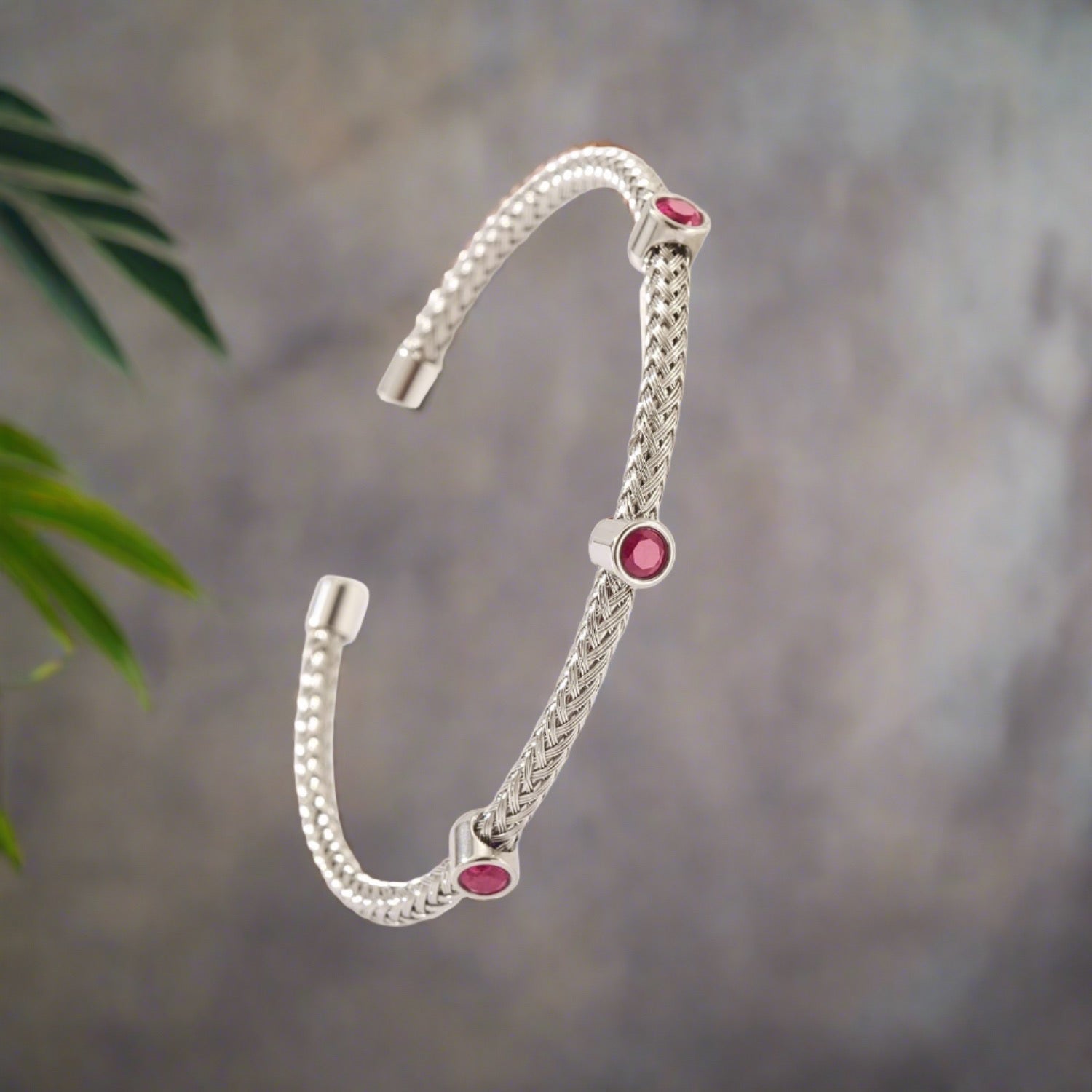 This exquisite Bangle Cuff is made of high-quality steel and adorned with beautiful ribbed patterns and a stunning red zirconia stone. Add a touch of fancy to your look with this elegant piece.