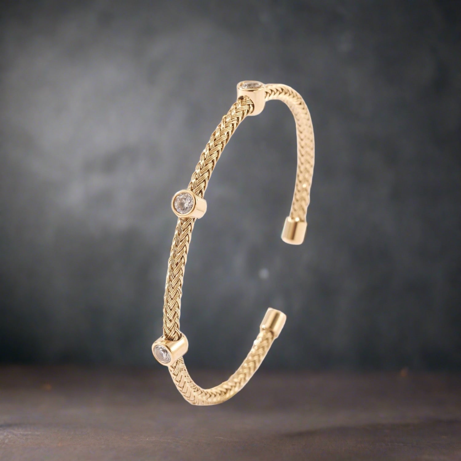 Experience elegance with our Bangle Gold Cuff Ribbed Zirconia. This cuff boasts a high quality design with ribbed details and sparkling zirconia stones. Elevate any outfit and add a touch of luxury to your accessory collection. 18k Gold Plated Steel