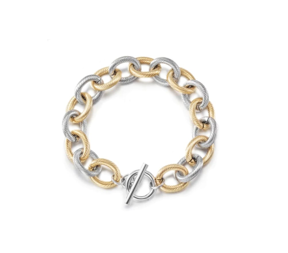 Expertly crafted with high quality steel and 18k gold plating, the Bracelet Illusion chunky Two Tone adds a touch of elegance to any outfit. Its unique two tone design creates an illusion effect, making it a versatile piece that can be dressed up or down. Elevate your style with this stunning bracelet.