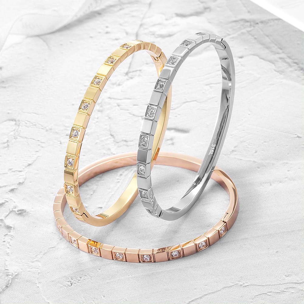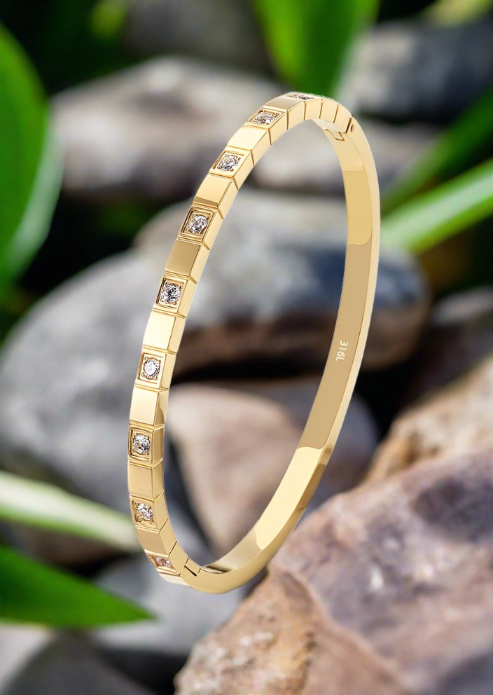 Expertly crafted from high-quality 18k gold plated steel, this bangle is designed to add a touch of elegance to any outfit. The sparkling zirconia stones add a touch of glamour, making it the perfect accessory for any occasion. Durable and stylish, this bangle is a must-have for any jewelry collection. 18k Gold Plated Steel