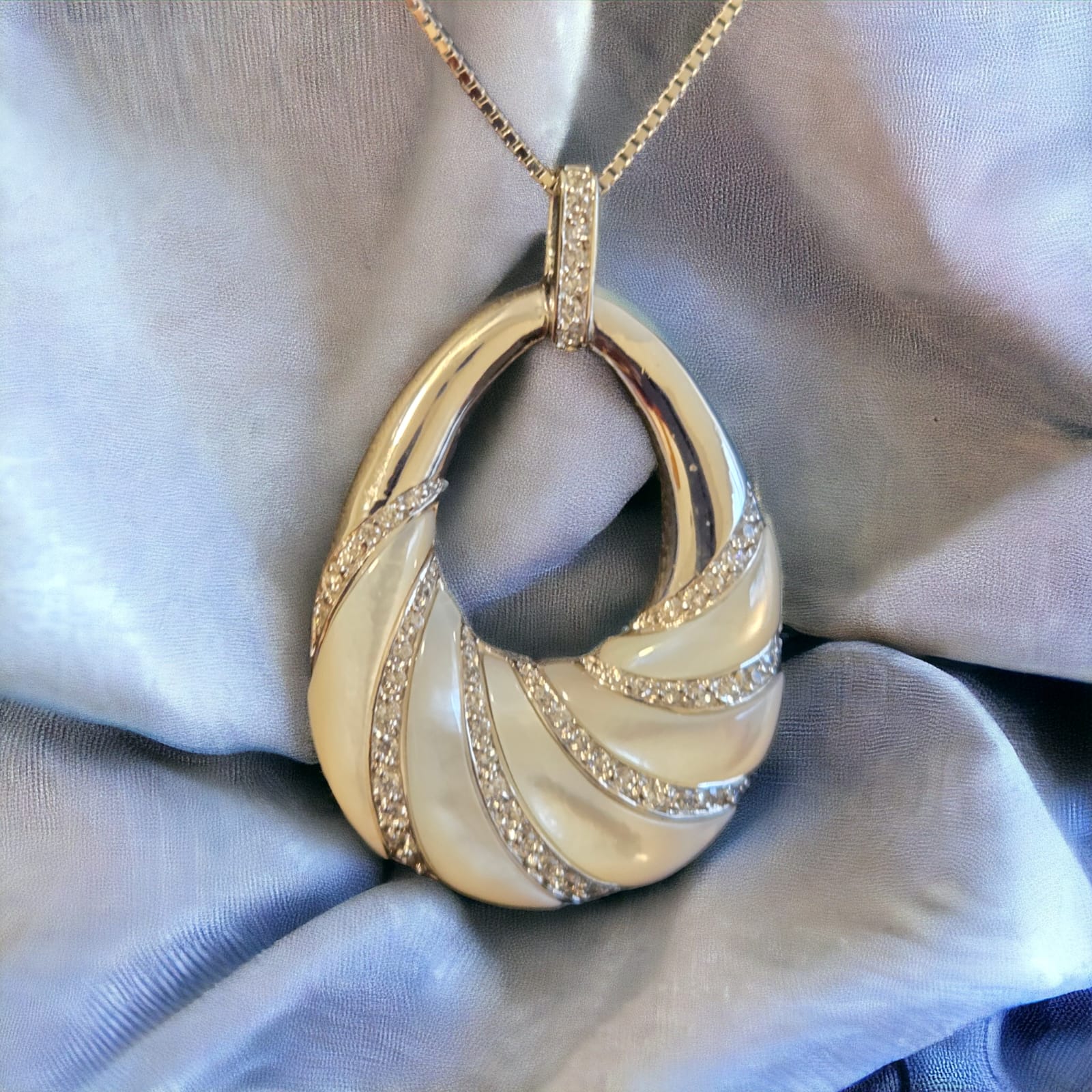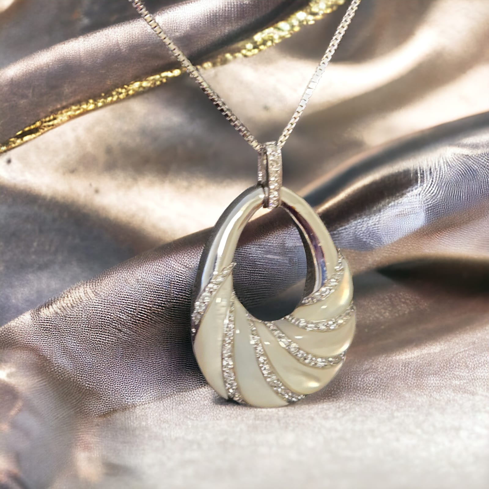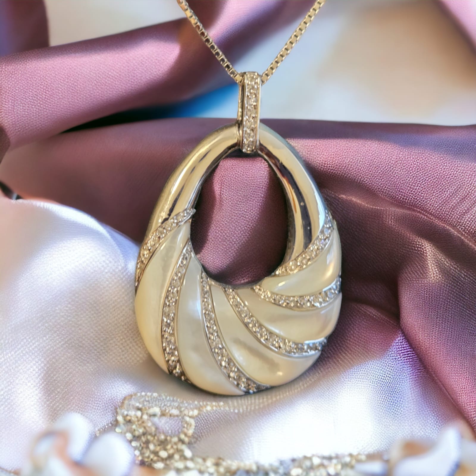 This elegant pendant boasts a beautiful mother of pearl set in sterling silver. With its impressive design and quality materials, it is sure to make a statement and elevate any outfit. The perfect accessory for any occasion.