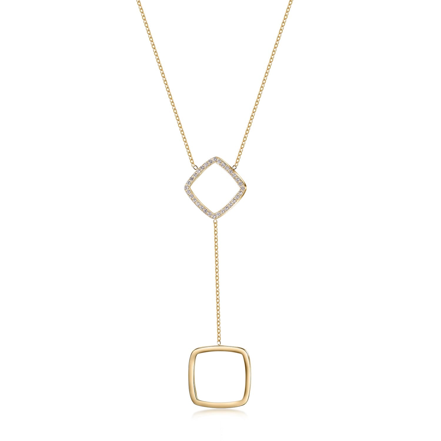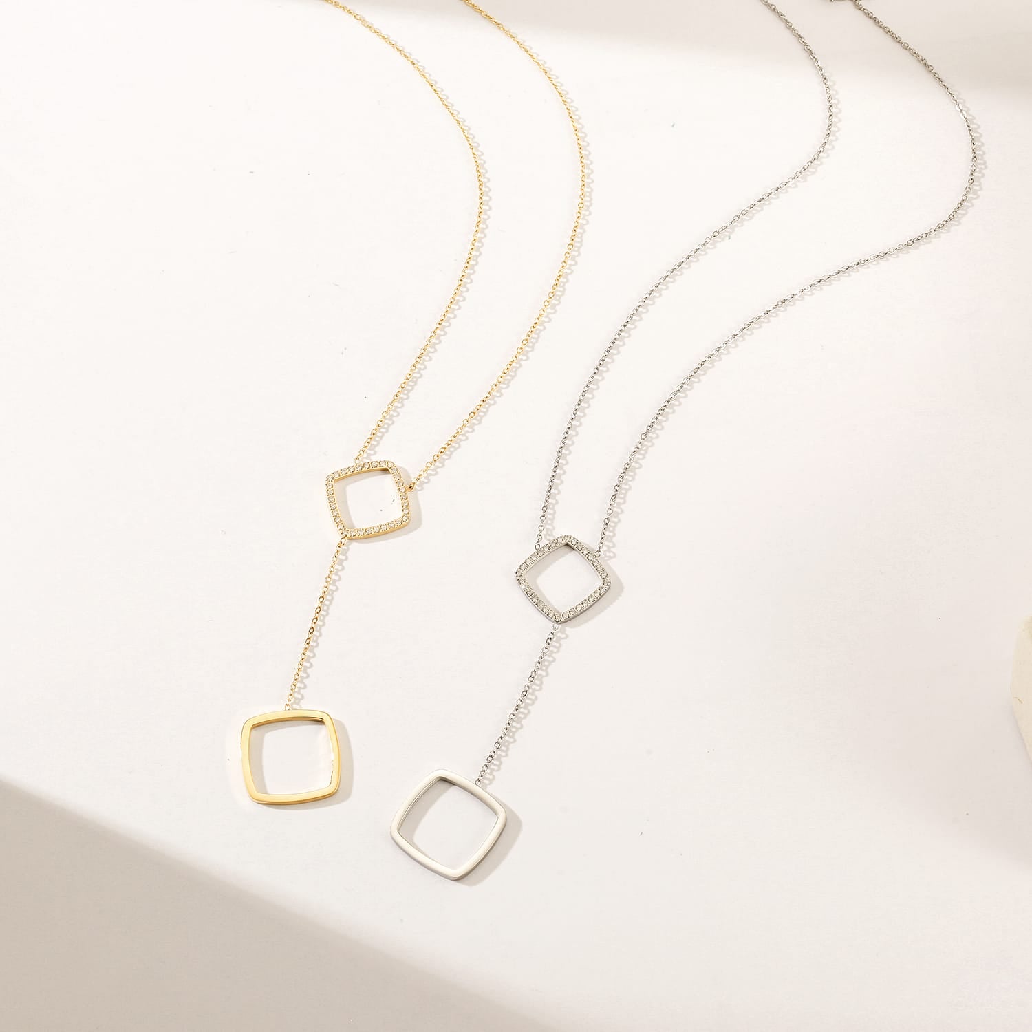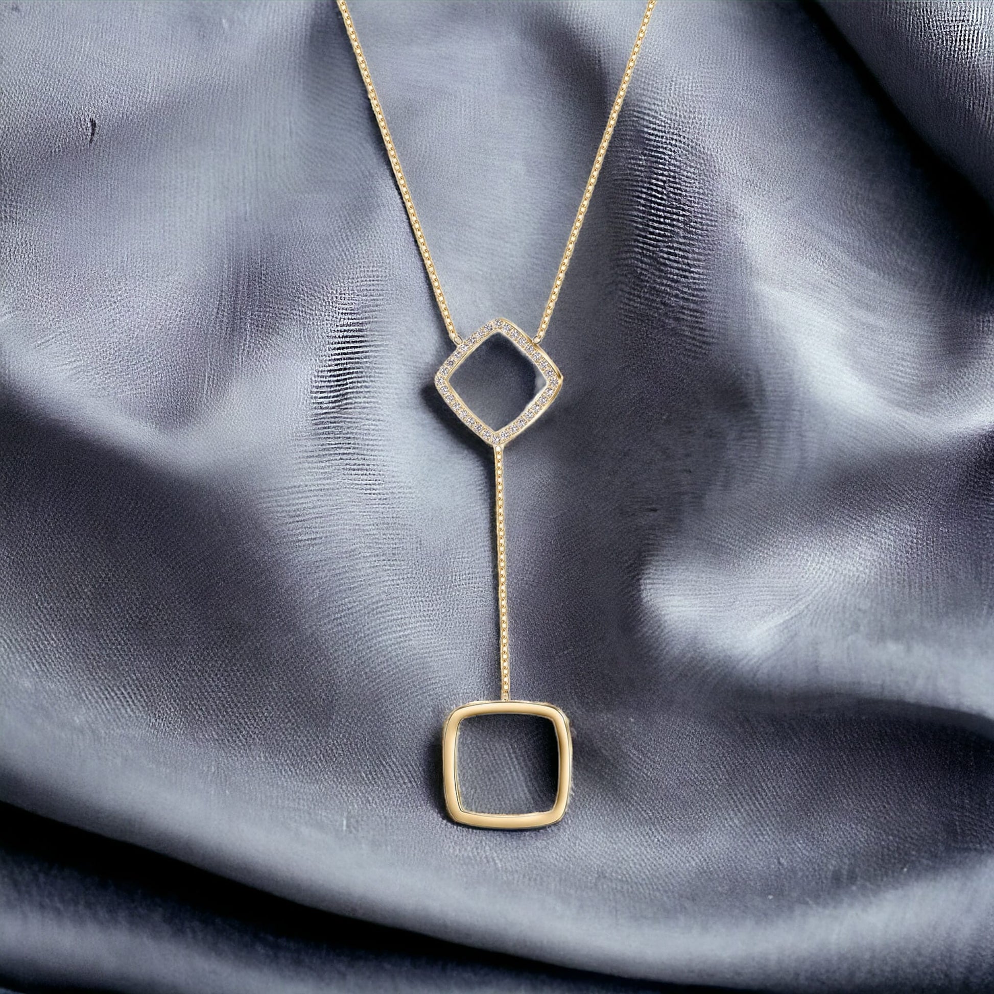 This is a luxurious and exclusive piece featuring open-framed squares and rectangles adorned with sparkling zirconia. A true delicacy, this dainty necklace exudes elegance and sophistication. Elevate your style with this stunning accessory. 18k gold plated steel .
