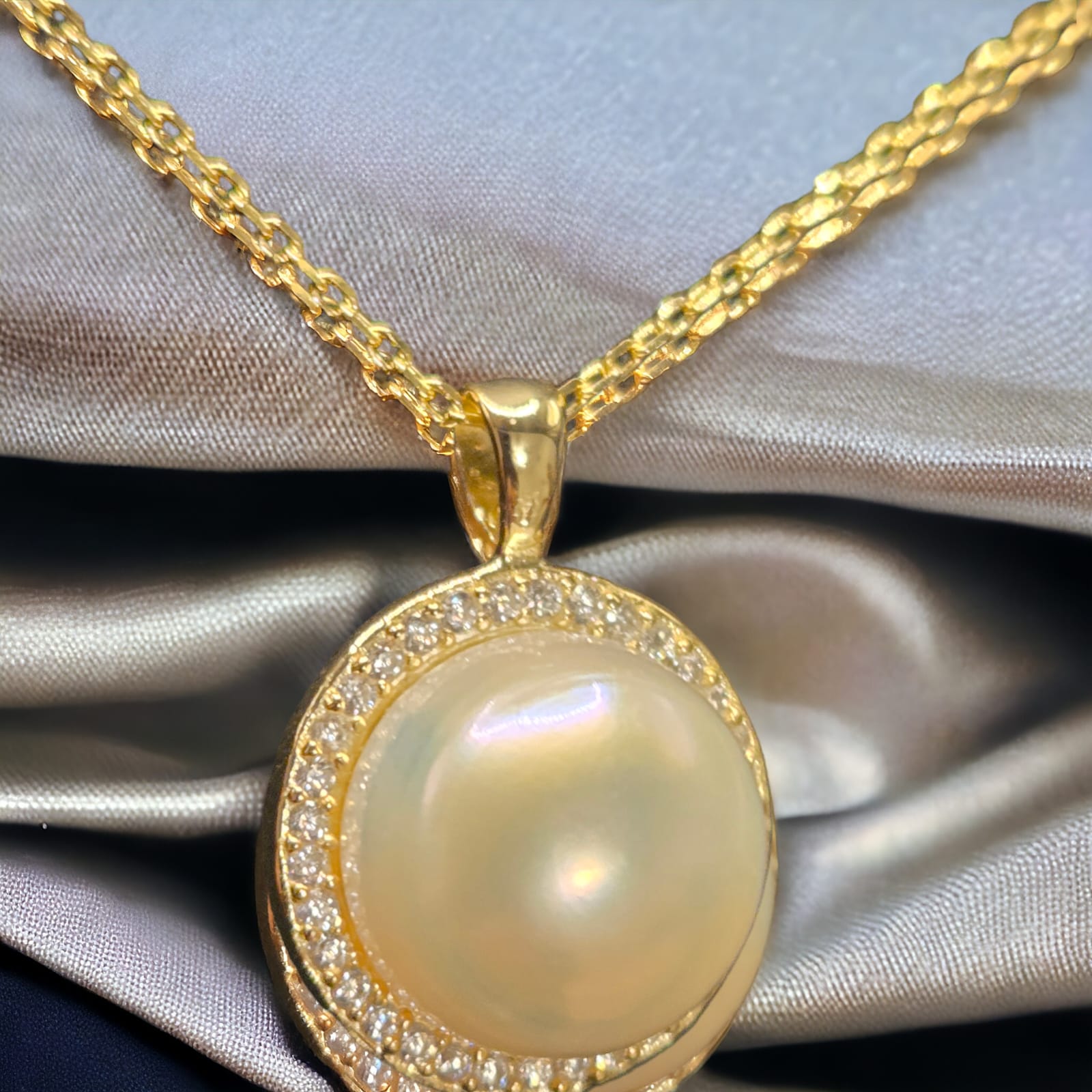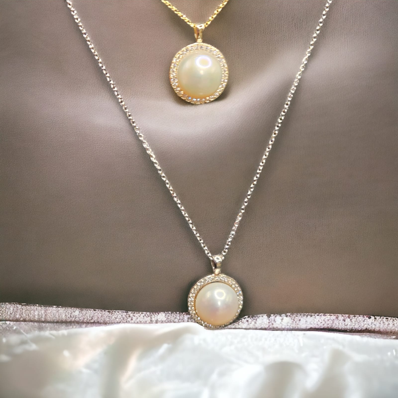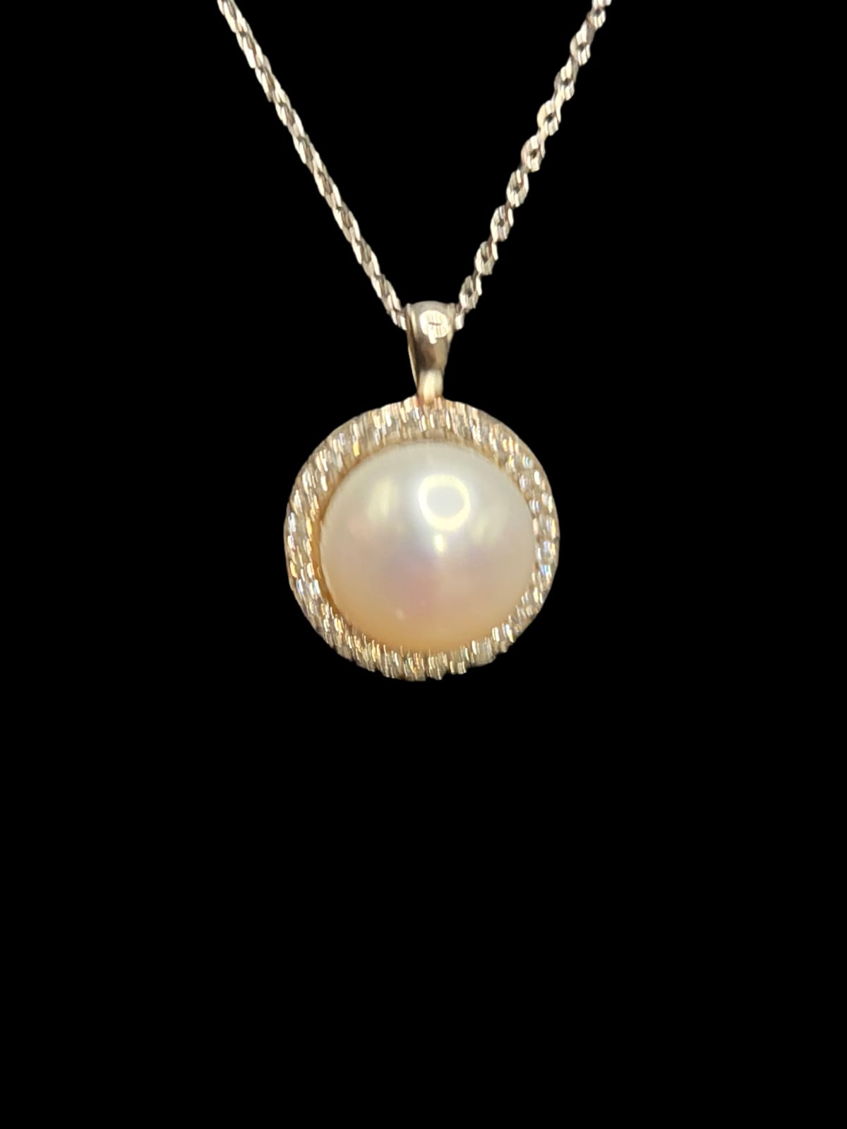 This necklace showcases a beautiful solitaire pearl pendant, exquisitely set in genuine sterling silver with a gold finish. The darling pearl is accented with sparkling cubic zirconia, adding a touch of elegance to any outfit. Perfect for that "CHICC" look