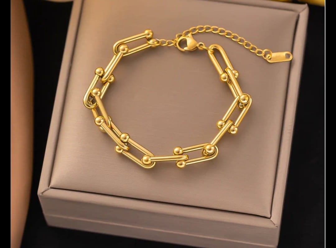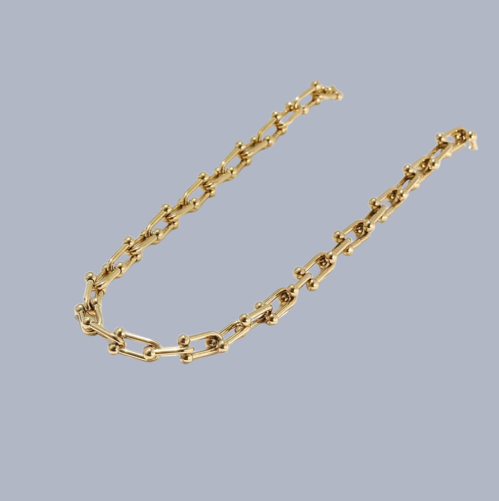 Be CHICC with our U link Chain 18K gold plated steel necklace collection Crafted with style and durability, this necklace exudes elegance and versatility. Perfect for layering or wearing on its own, it adds a touch of sophistication to any outfit. Make a bold statement with this piece.